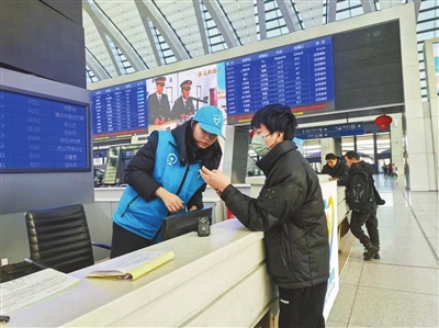 天津鐵道職業技術學院大學生志愿者在天津西站為旅客答疑解惑。學校供圖