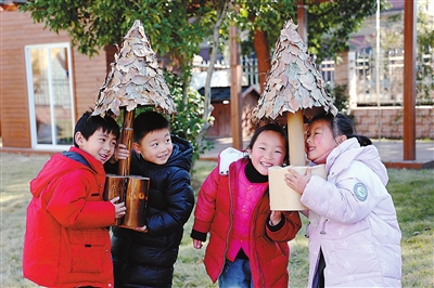 近日,浙江省諸暨市暨南街道街亭幼兒園的孩子們,利用落葉、硬卡紙、固體膠、棍子等材料制作了一棵棵富有大自然氣息的“小樹”。通過活動,孩子們不僅學會了合理利用廢舊物品,更鍛煉了動手能力。圖為孩子們把用落葉做成的“小樹”當“雨傘”玩。 陳霞芳 攝