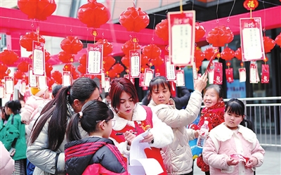 2月11日,在重慶永川青少年宮趣味游戲區,家人帶著孩子在猜燈謎。當日,共青團重慶市永川區委、重慶市永川區少工委舉辦“福蛇元宵,年味非遺”元宵游園會,設置非遺項目體驗區和趣味游戲區,讓孩子們和家長在這里樂迎元宵節。