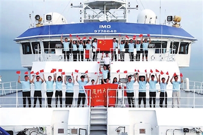 ①廈門大學學生們登上“嘉庚”號科考船開展海上科學實踐。