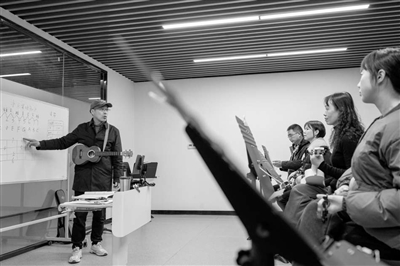 2月24日晚,在長興縣總工會工人文化宮,企業職工在公益講師的指導下學習演奏尤克里里。