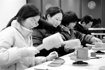 2月24日晚,在長興縣總工會工人文化宮,企業職工在非遺傳承人的指導下學習非遺紫砂壺制作。 譚云俸 攝