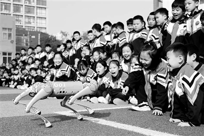 ①河北省邯鄲市邯山區(qū)農(nóng)林路小學(xué)學(xué)生與機(jī)器狗互動。郝群英 攝
