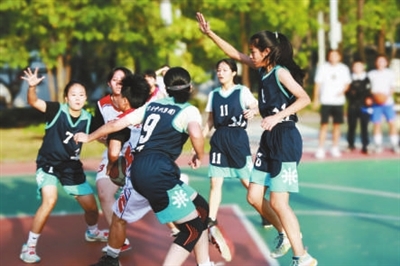 ④在深圳市寶安區(qū)中學(xué)生籃球比賽中,深圳市寶安中學(xué)(集團(tuán))女籃參加高中女子組冠亞軍爭(zhēng)奪戰(zhàn)。學(xué)校供圖
