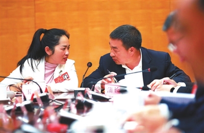 ①3月9日,小組會議期間,玉龍(左)和同組代表交流。