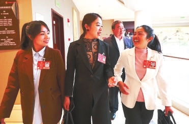 ②3月9日,上午的小組會議結束后,玉龍(右一)和代表們邊走邊交流。