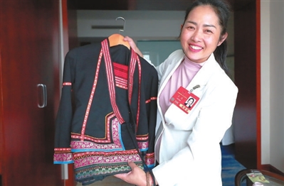 ③3月9日,玉龍向記者展示布朗族傳統服飾,希望更多人關注少數民族文化的傳承和發展。