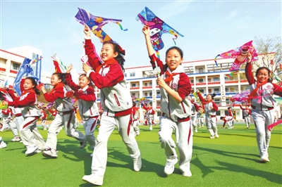 在江蘇省徐州市民主實驗學(xué)校,學(xué)生們在操場上放風(fēng)箏。 蒯創(chuàng) 攝