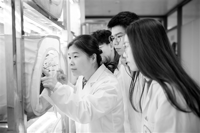 福建農林大學植物保護學院教授陳倩(左一)在農林生物安全全國重點實驗室指導學生觀察媒介昆蟲的習性。 福建農林大學供圖(資料圖片)