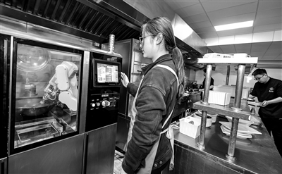 在可濃餐廳后廚,高約1.6米的“數字廚師”外形如同一個四方形帶門灶臺,這是一個使用機械臂實現多種烹飪技法的炒菜機器人。打開玻璃門,中央鐵鍋上方有一個透明鍋蓋,下方是電磁爐,右側是機械臂,鐵鍋四周環繞著調料盒、食材籃和廚具架,出油口、清洗口和下水口一應俱全。