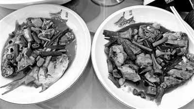 “數字廚師”烹制的炣雜魚(左)與手工烹制的同款菜品。 學校供圖