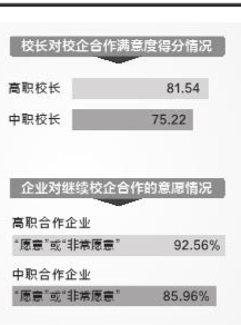 校企雙方對校企合作均表示滿意。調查結果顯示,高職和中職校長對學校開展校企合作呈現出較高滿意度,分別為81.54分和75.22分;其中中職校長對校企合作的滿意度較2019年上一輪調查結果提高了6.93分。高職學生和中職學生對學校從企業請來的教師教學水平表示非常滿意,分別得分84.98分和84.33分。有與職業學校合作經驗的企業,較為頻繁開展產教融合活動的企業數量占比78.83%,其中最主要的合作形式為接受實習生、到校開展招聘活動以及到校開展職業生涯規劃和發展宣傳。絕大多數企業在與職業學校開展校企合作、產教融合活動的過程中都有所收獲,特別是“降低企業培訓成本”“降低企業招聘難度”“提升企業知名度”方面,選擇“沒有明顯收獲”的企業數量僅占2.18%。與職業學校合作的用人單位,對校企合作、產教融合開展效果的整體滿意度均相對較高,此次調查中有87.82%的企業表示對合作成效滿意。其中,與高職學校合作過的企業有92.56%表示“愿意”或“非常愿意”繼續合作,與中職學校合作過的企業有85.96%表示“愿意”或“非常愿意”繼續合作。