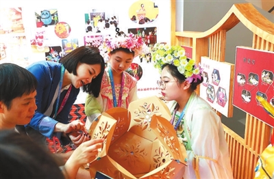 4月26日,第八屆中小學生藝術展演活動全國匯演實踐活動成果(工作坊)展示現場,一名觀眾(左一)興致勃勃地與福建省泉州市通政中心小學“拾光花燈”藝術實踐工作坊的師生一起制作花燈。 本報記者 張學軍 攝