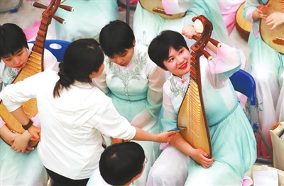 4月26日,第八屆中小學生藝術展演活動全國匯演器樂專場,候場期間,一名老師在仔細檢查學生的樂器。 本報記者 張學軍 攝