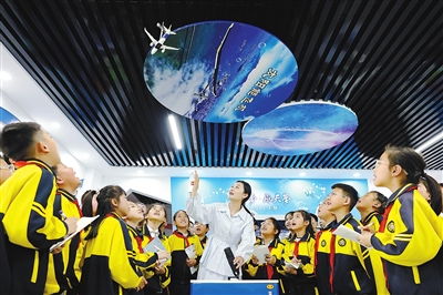 近日,在山東省棗莊市市中區(qū)文化路小學(xué)航天科普館,教師在講解“太陽能飛機(jī)”飛行知識,為學(xué)生普及航天知識,共筑航天夢想。 吉喆 攝