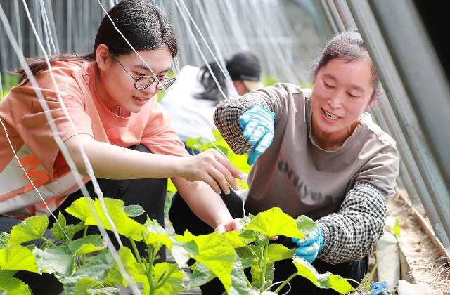 在北京市大興區青云店鎮小鋪頭村旭弘生態園蔬菜大棚里,沈陽農業大學植物保護學院應用化學專業2024級學生李芊諾(左)與索桂蓮大姐合作給黃瓜綁蔓