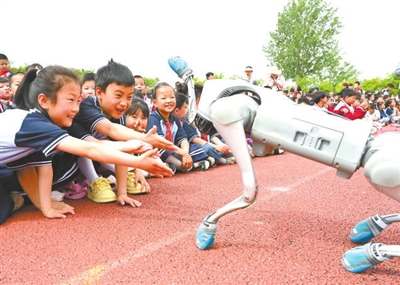5月13日,在江蘇省徐州市睢寧縣李集鎮中心小學科普活動現場,學生在和智能機器狗互動。近日,由江蘇省婦女兒童基金會、省青少年科技中心聯合開展的“百校科普行——科普進校園”活動走進李集鎮中心小學,通過豐富多彩的科學教育活動,培育青少年的科學意識和動手實踐能力,點亮孩子們的科學夢想。洪星 攝