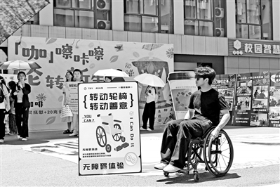 在無障礙體驗(yàn)區(qū),學(xué)生感受輪椅上的世界,轉(zhuǎn)動的不只是車輪,更是對無障礙社會建設(shè)的思考。 胡揚(yáng)輝 張貝貝 攝