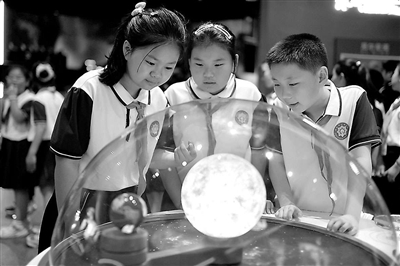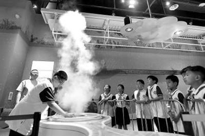 左圖:5月25日,山東省青島市市北區開平路小學學生在青島科技館參觀“潮汐”裝置。