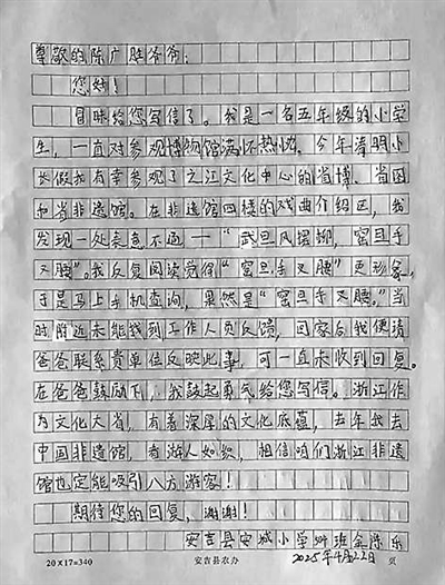 原來,金陳樂和家人一起到之江文化中心參觀時發現了一個錯別字,在父親的鼓勵下,他寫信給陳廣勝廳長希望能把這個錯別字改掉。令人意想不到的是,信寄出后沒幾天他便收到了回信,陳廣勝在信中告知錯別字已修改并向金陳樂表示感謝。