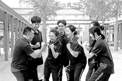 6月7日,在山東高密市第五中學考點,教師與考生一起加油鼓勁。李海濤 攝