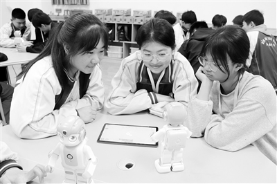 ①學生在實踐中心體驗人工智能機器人。