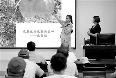 6月16日,在位于陜西省渭南市白水縣的西北農林科技大學蘋果試驗站,老師和翻譯為培訓班學員介紹中國蘋果新品種。