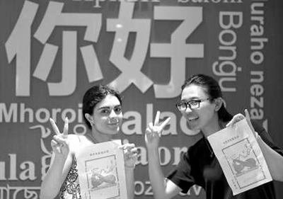 6月17日,北京外國語大學(xué)的意大利畢業(yè)生馬芙藍(左)與她的老師田衛(wèi)衛(wèi)一起展示她們制作的木版水印作品。