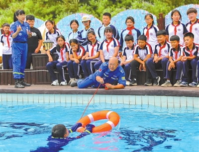 6月26日,在河北省秦皇島市海港區王莊小學,藍天救援隊隊員為學生演示溺水救援。曹建雄 攝