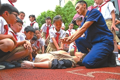 6月24日,在江蘇省太倉市弇山小學,消防隊員為學生講解急救知識。計海新 攝