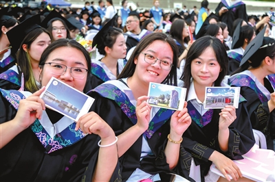 在山東第一醫(yī)科大學畢業(yè)典禮現(xiàn)場,幾名畢業(yè)生手持學校文創(chuàng)明信片合影留念,定格青春記憶。張家興 攝