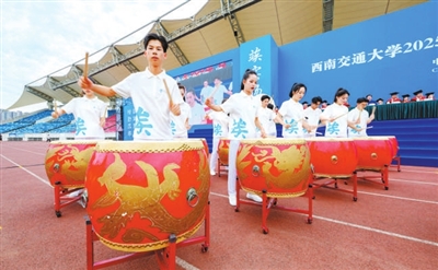 在西南交通大學2025屆學生畢業(yè)典禮暨學位授予儀式上,大學生藝術團與畢業(yè)生代表共同表演鼓樂《鼓翼乘風》。 鞠紅偉 攝