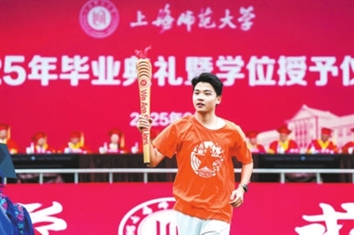 在上海師范大學2025年畢業(yè)典禮暨學位授予儀式上,畢業(yè)生傳遞火炬,寓意薪火相傳、播撒希望。學校供圖