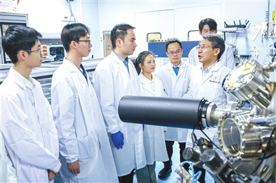 中國(guó)科學(xué)院院士、南方科技大學(xué)校長(zhǎng)薛其坤(右一)和團(tuán)隊(duì)成員在實(shí)驗(yàn)室。