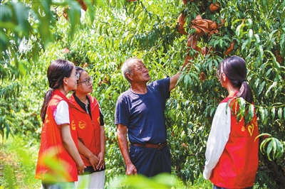8月13日,在河北省邯鄲市復興區戶村鎮大滋然生態農業有限公司,返鄉大學生在聽取果農講述鮮桃套袋技術,在實踐中提升綜合素養、厚植鄉土情懷。 聶長青 陳夢千 攝