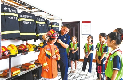 8月16日,河南省濟源市文昌路小學學生在濟源市濟水同心街消防救援站體驗穿戴滅火防護裝備。