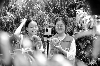 8月13日,在河北省邯鄲市復興區戶村鎮大滋然生態農業有限公司,大學生在田間地頭直播銷售蟠桃。 聶長青 陳夢千 攝