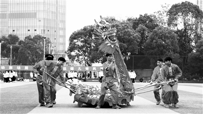 學生在運動會開幕式上進行舞龍舞獅表演。 汪洋 攝