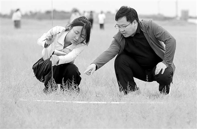 8月21日,陜西省定邊縣白泥井鎮(zhèn)大水村的一片鹽堿地里,西北農(nóng)林科技大學(xué)副研究員李偉正在給張夢婕(左)講解植物群落調(diào)查的方法。