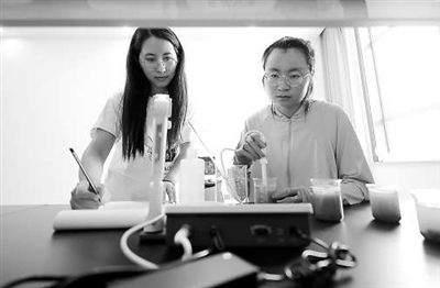 8月21日,陜西省定邊縣生態(tài)氣象聯(lián)合實驗室里,張夢婕(右)在西北農(nóng)林大學(xué)博士生指導(dǎo)下進(jìn)行土壤理化特性測定。靳軍 本報記者 張學(xué)軍 攝