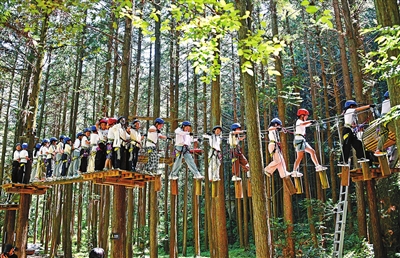 浙江省臺州市仙居縣橫溪鎮中心小學開展“穿越叢林 強健體魄”戶外研學活動,學生們體驗“叢林穿越”戶外運動項目。王華斌 攝
