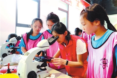 四川省瀘州市納溪區組織“老少同聲頌黨恩·攜手奮進新征程”青少年夏令營活動,孩子們在志愿者的幫助下觀察人體細胞。廖勝春 攝