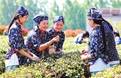 在山東省棗莊市市中區孟莊鎮大郭莊村茶園,茶農向前來參加研學活動的中學生傳授采茶方法。吉喆 攝