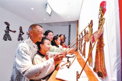 湖北省襄陽市保康縣城關鎮小學組織學生走進保康縣文化館,開展“體驗多彩非遺,感受文化魅力”主題研學活動,圖為民間皮影藝人指導學生表演皮影戲。楊韜 攝