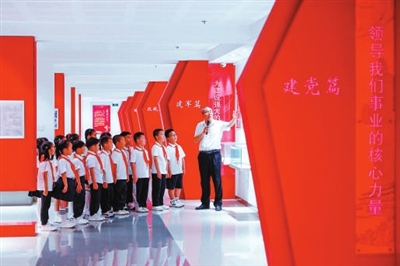 江蘇省海安市明道小學師生來到位于該市城東鎮泛書房的“沒有共產黨就沒有新中國”紅色報紙展覽館,開展以“追尋紅色印記 汲取奮進力量”為主題的暑期紅色研學活動。 顧彬斌 攝