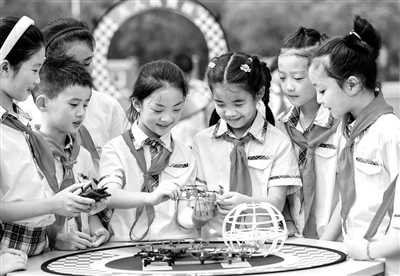 9月8日,江蘇省海安市城南實驗小學學生在了解無人機性能。近年來,該校將無人機、機器人等科技創新元素融入學校第二課堂,培養學生對科學技術的興趣和愛好,零距離感受科技魅力。