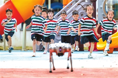 近日,浙江省湖州市長興縣龍山幼兒園的孩子們與機器狗進行跑步比賽。該園為孩子們講解機器狗和無人機等設備的相關知識,讓孩子們零距離感受科技魅力。 譚云俸 攝