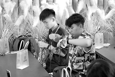 東盟國家職業教育來華留學生體驗中國文化。圖①為學生在體驗壯族刺繡。圖②為學生在制作五子養生錘。圖③為學生在練習仿宋點茶。