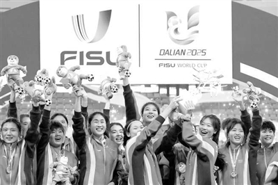 9月27日,上海體育大學女足成員在頒獎儀式上。當日,在大連舉行的2025年國際大體聯足球世界杯女足決賽中,中國上海體育大學女足3比1戰勝加拿大拉瓦爾大學女足,奪得冠軍。 新華社記者 鄭煥松 攝