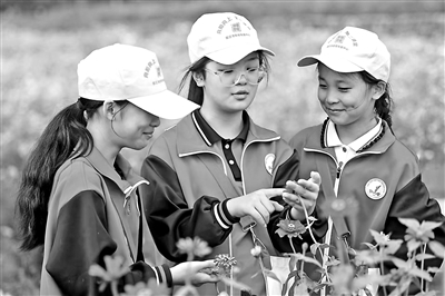沭陽縣懷文小學學生在公園中觀察植物的生長情況,記錄植物的發芽、開花等過程。胡威 攝